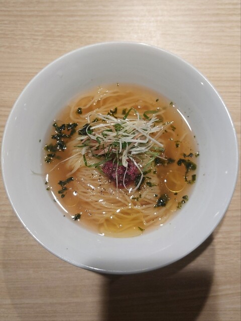 白髪葱、茗荷、大葉、アオサ、しば漬けと薬味たっぷりの〆ラーメン。スッキリとしたスープにトッピングを混ぜ込むと、塩カドのない旨味が広がり、ややウェーブがかった中細麺と抜群の相性。焼肉後でも箸が止まらない完成度。