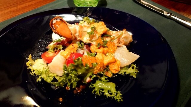 私の一皿目 海の幸のサラダ仕立て ウニ、たこ、ほたて、えび、いくらetc 宝石箱のような海の幸
