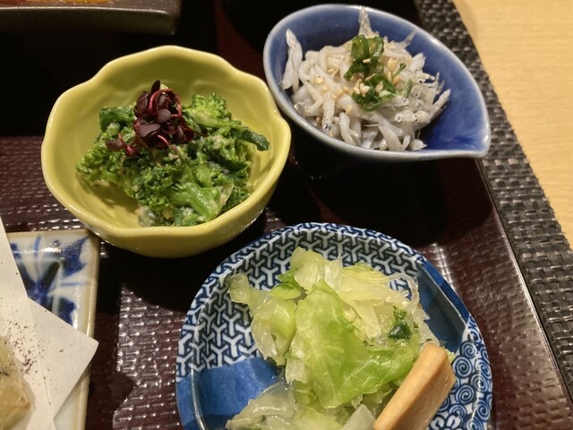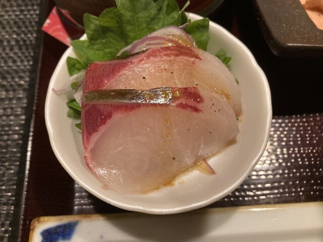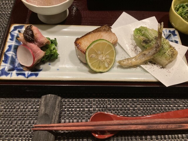 松坂豚の焼き物や菜の花のお浸し、ワカサギの天婦羅、旬の鰤の焼き物にプリプリの鰤の