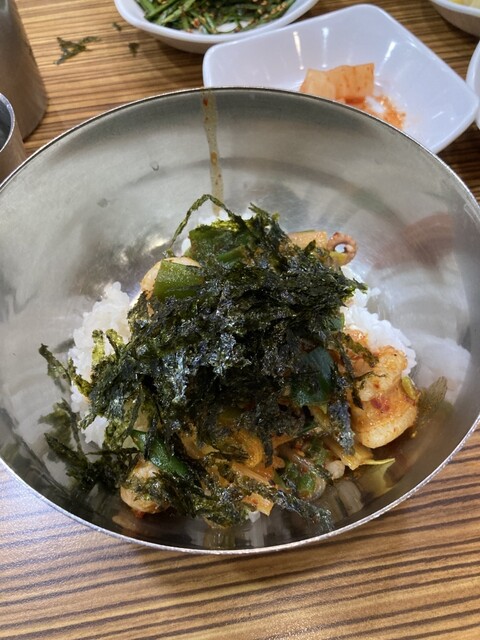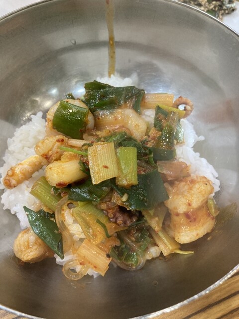 甘辛いたれで煮込んだ、プリプリの海老、ホルモン、タコをご飯の上にのせて、ニラと韓国海苔をたっぷりかけて食べると最高です。
