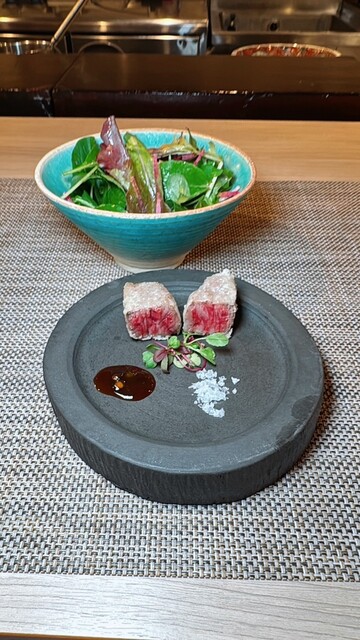 大阪の阪南市の牧場で育てられ、月に約5頭しか出荷されていない希少な黒牛を、グリーンペッパーソースと無添加の海水のみで作られたイギリスのマルドン塩でシンプルに和牛の旨みを味わえます