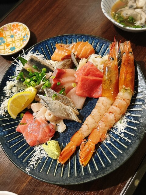 まずは海鮮攻めで、刺身盛り合わせ&大人の松前漬け&筋子のせ味玉を注文。
