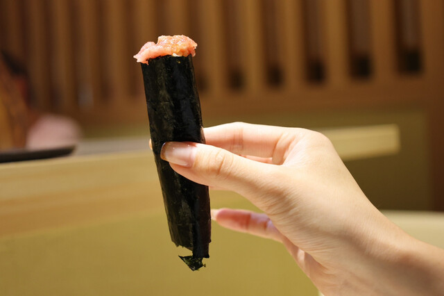 └ 細長く丁寧に巻かれたとろ巻きは、海苔のパリパリとした食感が心地よい。
