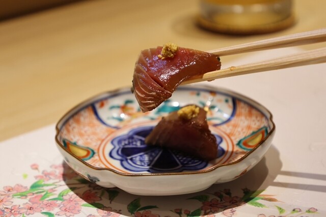 └ 光り輝く美しい赤身の漬けは、上に乗っているのは意外にも柚子胡椒。ピリッとした柚子胡椒の風味が、赤身の濃厚な旨味と驚くほど良く合い、新しい発見でした!