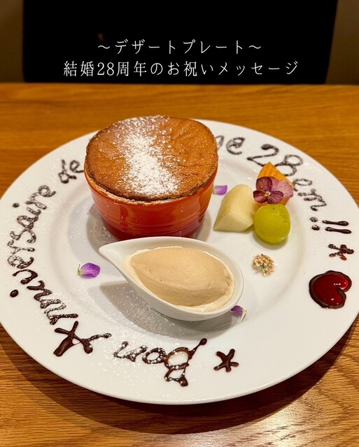 シメのデザートは予約時にお願いしていた結婚28周年のお祝いメッセージ付き