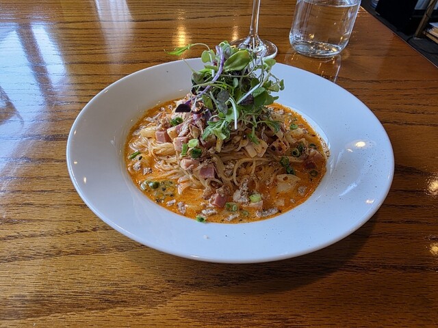 普段定休日なのですが、SNSで営業されると記載されてたので、妙な感じですが来てみました。車で来たけど、まずは食前酒。スパークリングワインならぬ、スパークリング日本酒。水のようにさらりと飲めて、仄かにお酒っぽい?ぽい?はい、こちらはチェリオさんの「のんあるこーる 日本酒風味」店主さんが、面白い商品を仕込んでくれたので、試してみました。ホントに甘酒以上にお酒飲んでる感覚になりました。これに合わせる料理は、担々麺風冷製パスタ。カッペリーニを使って、担々麺の麺を再現。食肉学校のベーコンとザグザク野菜が美味しい。この辛さをスパークリング日本酒風味で打ち消す。デザートは、スキレットチーズケーキ。鉄製フライパンに熱々のチーズケーキ。熱々のうちが柔らかく、担々麺風のパスタが辛めだったので、甘味が調和して別腹に入りました。来店した時間は、ほぼ貸切状態。此れで暑い日も乗り切れそうです。美味しかったです。