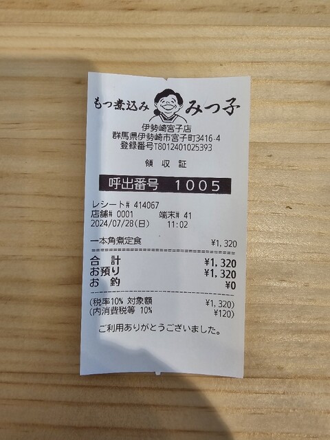 伊勢崎市宮子町にある、もつ煮込みみつ子さんです。もつ煮込みと謳っていながら、かねてから食べてみたかった、一本角煮定食を食券機で購入。吊るしベーコン並みに大きい角煮は、柔らかく、流石に箸で切り切れないので、キッチンハサミでカットしながら食べると、味もしっかり付いて、脂身は柔らかく、赤身も柔らか過ぎず、食べ応えありました。食券も、現金以外にクレカや、コード決済にも対応してて、良かったです。基本的に食券買ったら、水含めて完全セルフです。席は20人でいっぱい。番号で呼ばれるので、呼ばれたら、丼にご飯と角煮が載ってるので、お椀に味噌汁を入れて自席へ。ご飯はお代わり無料だったと思います。食べるのが遅い私でも、30分程で完食したので、満席でも回転率良さそうなので、待てば食べられそうです。今度は、もつ煮を食べ比べしたいなと思います。
