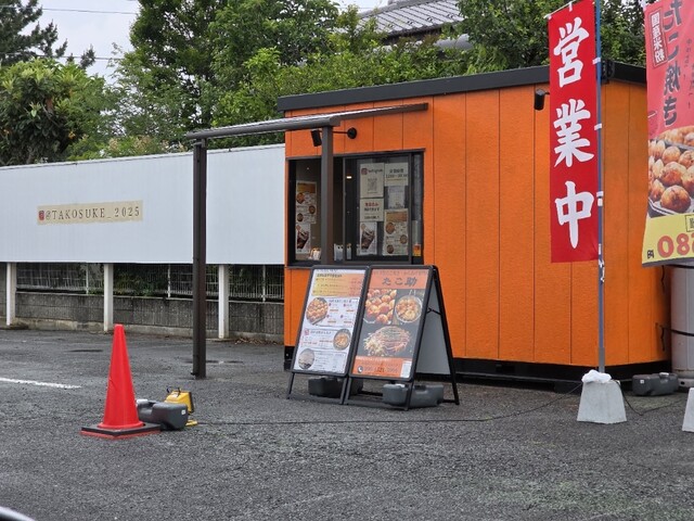 伊勢崎市今泉町のくら寿司さんとスターバックスカフェさんの北側。元の快活CLUB今泉町店さんの駐車場に出来た、たこ助さんへ行ってきました。注文受けてから焼いてるので、現地注文だと、待ちます。急ぎなら事前に電話注文を推奨します。たこ焼き大きさは、銀だこさん並に大きいのですが、表面を揚げてないので、食べた時に焼けた生地と、中の生地の固さが、「サクッ、トロッ」って感じで、食べやすく美味しかったです。唐揚げも、もも肉にしっかり下味が付いて、竜田揚げでは無いので、片栗粉程ザクザクしてないです。それでも、他の唐揚げの衣よりも、しっかりしてる感じです。今回は両方食べたかったので、「たこ助たこからセット」、基本的にソースマヨのたこ焼き6個に唐揚げ3個のセット。たこ焼きは、差額を払えば、他のたこ焼きに変更してくれます。私は胡麻油&塩にしたので、1020円でした。胡麻油と塩は別容器なので、自分で味付け出来ます。食べ方としては、白飯付けてたこ焼き唐揚げ定食も良し、ピールのあてや、おやつにも良しです。あと、その場ですぐ食べたい方へ、マイ箸必須かもです。箸や楊枝の類いは、入ってませんでした。日頃から、割り箸だけでも携行をオススメします。