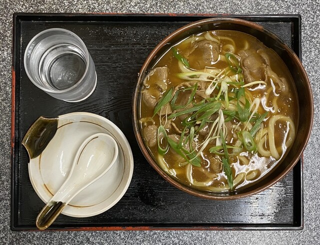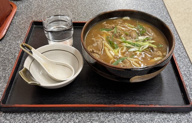 オーダーが入っての茹で・・・出食迄は少し時間が・・また、カレースープも「丼・うどん」とは配合が異なり・・・一杯づつ仕上げに・・具はシンプルで牛・刻みネギ・・・兵庫県産の牛(赤身の多い肩ロース)切落とし、牛の味・食感よく美味しさアップ・・・刻みネギは長めにカット、食感と風味が活きる・・