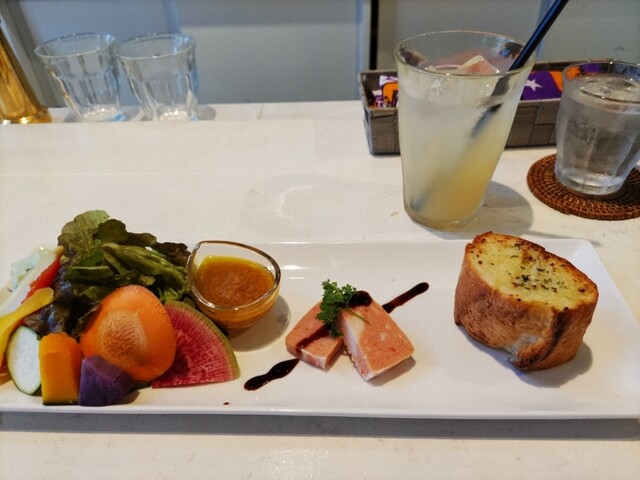 サラダ、前菜、ガーリックトーストはひと皿に盛り付けられています。