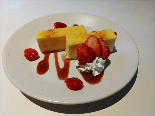 いちご、生クリーム、ベリーソースが添えてあり、表面はあぶってあって、パリッとしてます。