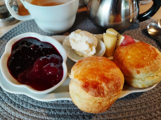 自家製スコーン、自家製ジャム、クロテッドクリーム、フルーツ(キウイ・ぶどう)