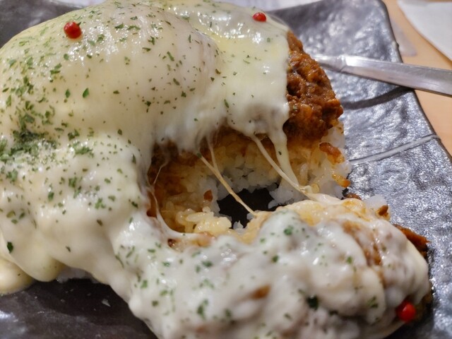 白いご飯の上にチキンカレー、半熟卵が乗って、チーズとパン粉を乗せて焼いてあります。