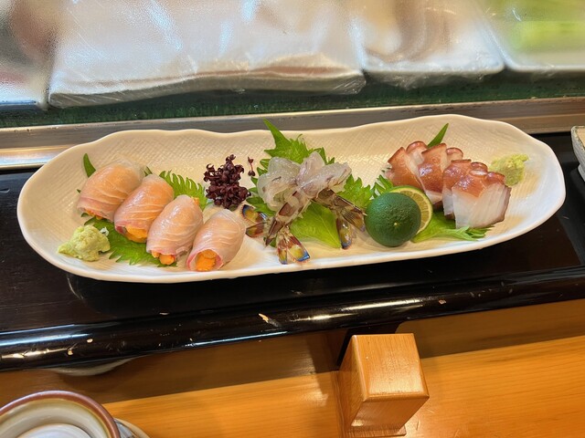 車海老のおどり、ウニのイカ巻き、タコの刺身