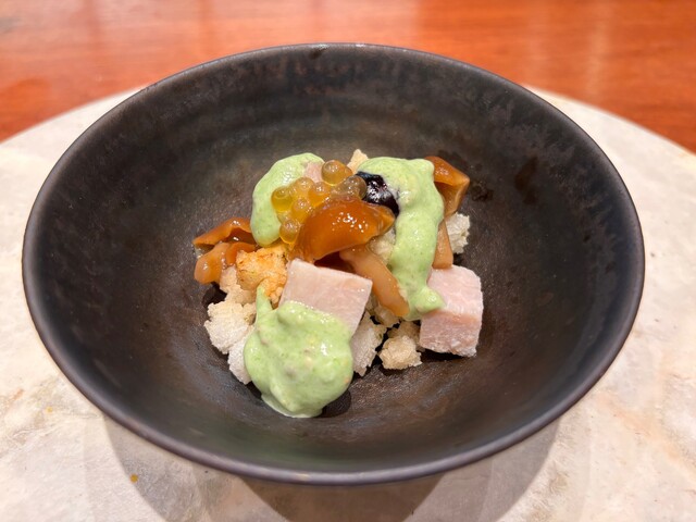 松尾シェフは帝国ホテルのフレンチで腕を磨かれた本格フレンチのシェフであり、その確かな技法をベースに、東京の食材を使いながら、他ジャンルのエッセンスも取り入れつつ見事なコースに仕立てておられました。