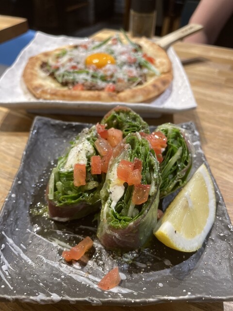 クリームチーズやバジルの味がビールに合う生春巻き、レモンパスタはあっさりとした味わいでどんどん食が進みます。ガッツリと食べたい方におススメなスキヤキ仕立てのピザで満腹です。