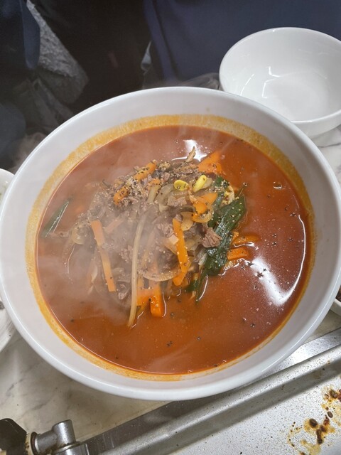 センマイ刺し、キムチ、玉子スープ、ユッケジャン麺、中守りキャベツ、中ライス、生ビール、マッコリボトル