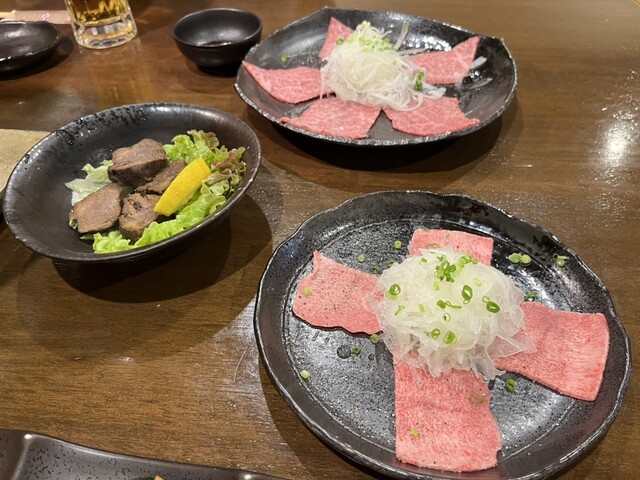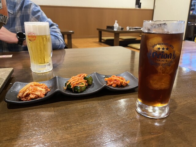 注文は、焼きしゃぶ、ネギタン、カルビ、ロース、茹でタン、マルチョウ、キムチ盛り合わせ、小ごはん、飲み物です