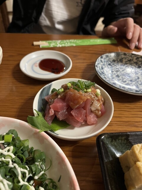 注文は、マグロ赤身盛り、マグロ酒盗、ネギまみれカツオ、エビマヨです