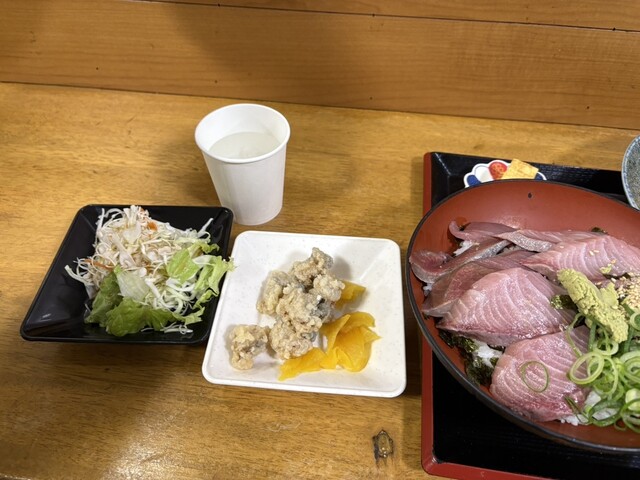 寒ぶり丼 白い皿 沢庵、しば漬け、さば南蛮漬け、野菜サラダ