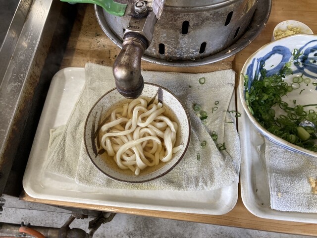 【かけうどん小を受け取り、テボに麺を入れ器にお湯をかけながら湯掻きます⊂((・x・))⊃薬味のネギと天かすを入れて、今日はオーソドックスな天ぷら、ちくわ天とおあげトッピング、きつねうどんにしましたよ(≧∀≦)】