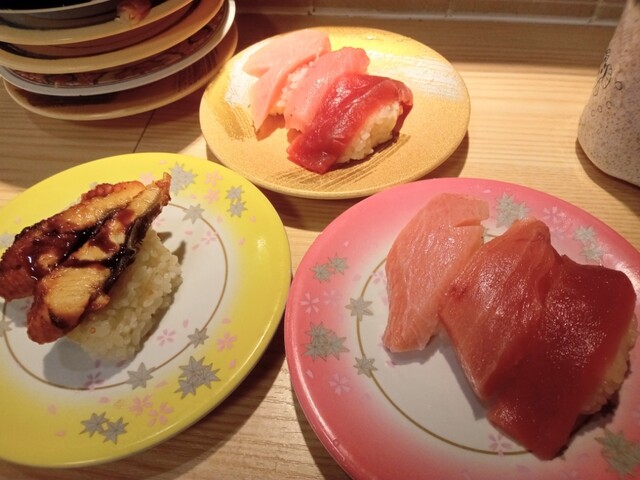 まぐろ3貫は赤身強く見栄え今ひとつで柵の様な乱切りもあったりですが、大きく切られ冴えた旨味があり意外