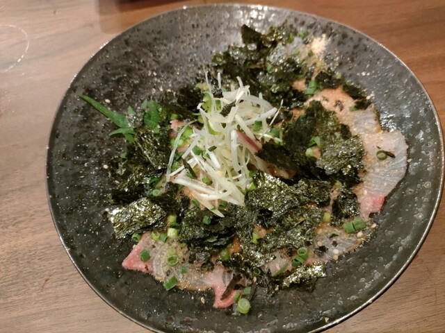 間違いのない一品。カンパチの上にゴマダレ、薬味が乗せられた一皿。脂の乗ったカンパチと薬味がよく合います。お刺身も置いてあるのはうれしいですね。