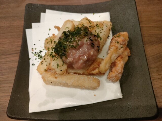 外はサクッと、中はホクッと揚げられた山芋と酒盗がめちゃくちゃ合います。そしてお酒がすごく進みます…!