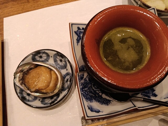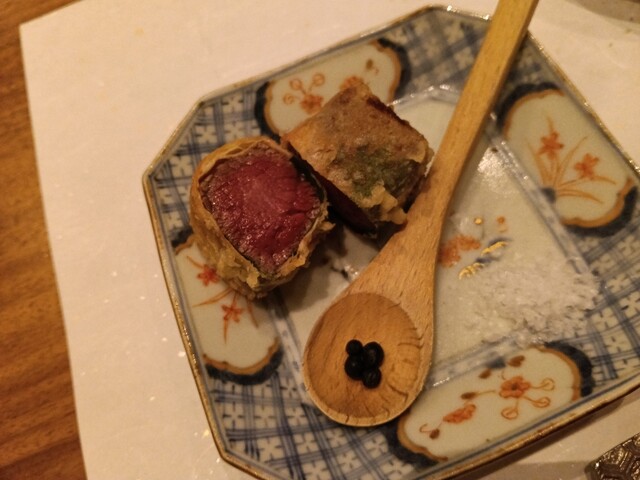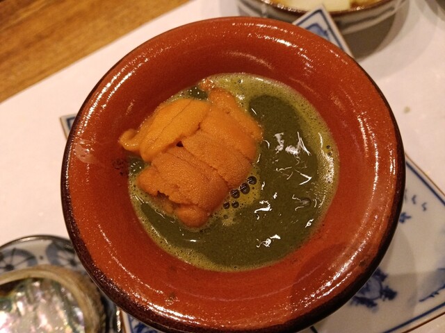 こちらだけでも十分美味しいのですが、アワビを食べ終わると、小さいおむすびの天ぷら・うにをソースの中に入れ、リゾットのようにして食べます。これが鮮烈な海の香りのハーモニーで非常に美味しい。ご飯が天ぷらにしてあるのも、衣の食感が効いていて良いなと思いました。