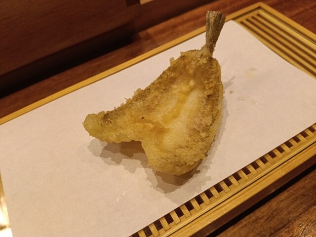海苔の天婦羅の上に、大間の本マグロ、ウニ、キャビア、山葵が乗った一品。ピザのように食します。具材が豪華なのもそうですが、海苔が天婦羅されていることで食感やごま油の香りが効いているなと思いました。