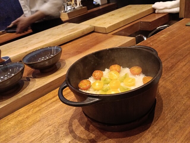 なんと、ミニトマトの炊き込みご飯に、海老、ホタテなど具沢山の大きなかき揚げを混ぜていただく一品。最初にトマト炊き込みご飯のみ一口いただいたのですが、これが美味しい。トマトの酸味と甘みが炊き込みご飯に合うのです。