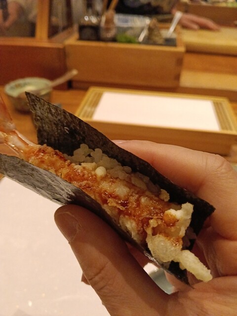 今度は車海老が海苔巻きで供されます。海苔の香ばしい香り・ごま油の香り・お米が一体となりこれがものすごく美味しい・・・!単体で食べるよりも複雑な味になります。
