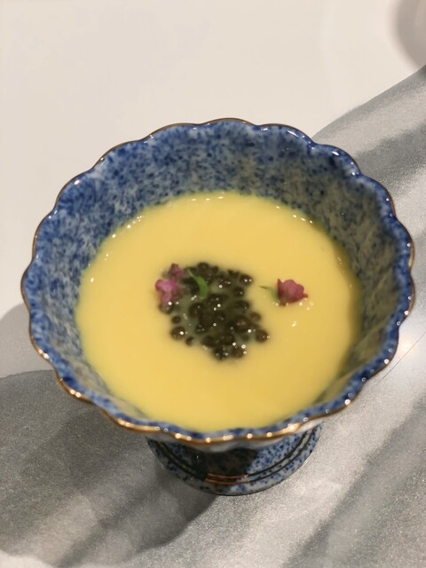 キャビアは、だし洗いしてあって、濃厚な味わいで口の中でとろけました。