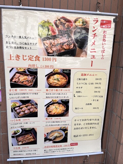 お盆には香ばしく焼かれたきじ重、鶏つくね2本、サラダ、しば漬け、お吸い物がのっています。