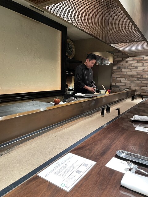 今回は知人の紹介でこちらのお店に初来店。カウンター席に案内され、3人横一列にならんで食事会がスタート。この手の高級焼肉店でカウンター席に座るのは初めてかも。カウンターの前には灰?が横長に敷かれ、その中に五徳が置いてあり、網を乗せて焼く炭焼きタイプの焼肉店。今回はオーナーに焼いてもらうという贅沢な焼肉が開宴!