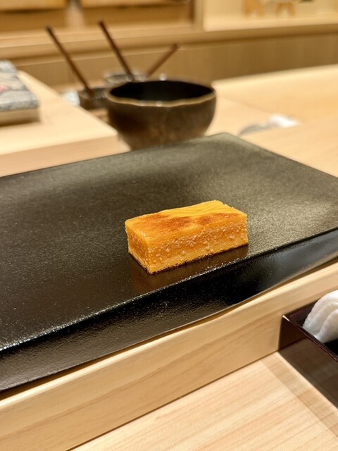「卵焼き」は18個もの卵黄を使い、しっとりとした口当たりで、やわらかな甘みがじんわりと広がる。卵黄と白身魚のすり身が加わることで生まれる淡い旨味が、焼き目の香ばしさと重なり、ほのかに香る卵黄の濃厚さが口の中に残る。まるでカステラのようなふうわりとした食感があり、最後の一口まで飽きずに楽しめる仕上がりだった。