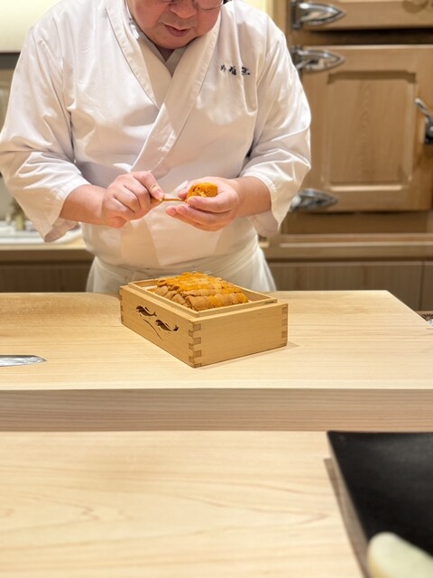 「うに」は馬糞ウニの握りで、これでもかという量のウニがシャリの上に堂々と乗る。とろけるような舌触りで、クリーミーな甘みが一気に口の中に広がり、ふわりと海の香りが鼻を抜けていく。温かいシャリとのコントラストが心地よく、口いっぱいに広がる贅沢な旨味に、しばし無言で向き合ってしまう。大将の豪快さと繊細さが同居した一貫だった。