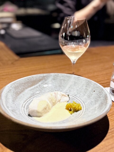 しっとりと蒸し上げられた肉厚のヒラメは、存在感のある身質をブルーチーズと鱧の卵、生クリームなどで作られたソースが力強く支える。濃厚だが重さはなく、魚の旨みを引き立てる仕立てが巧みだ。柿の葉が秋らしさを添え、菊花を酢で和えた添え物が軽やかに全体を整える。アニエス・パケの白ワインと合わさり、一皿の奥行きがさらに増していた。