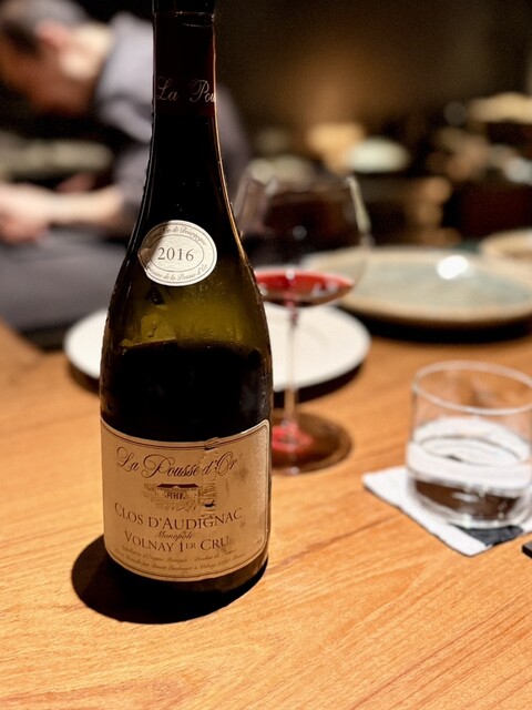 柔らかくジューシーに火入れされたランプは、バルサミコと醤油のソースで旨みが引き立つ。付け合わせに椎茸ときんぴらごぼうというユニークな組み合わせながら、驚くほど自然に調和していた。ラ・プス・ドール・ヴォルネイの骨格ある余韻が全体をまとめ、印象に残る一皿だった。