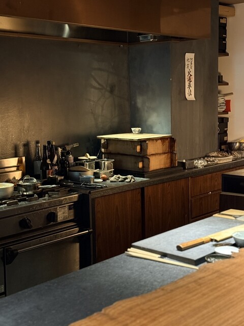 駅を出るとすぐに、木と土壁が調和した落ち着いた雰囲気の店構えが目に入る。入口には枝ものがさりげなく置かれ、静かな存在感を放っている。扉を開けると、黒い壁の前で炭火が赤々と揺れ、思わず期待がふくらむ。店内は大きな一枚板のカウンターが中心で、席につけば料理長の手元を間近に眺められる贅沢なつくりだ。