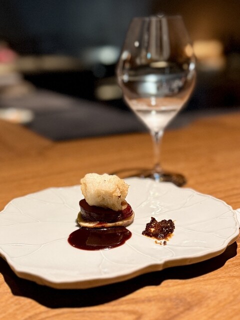穴子は軽やかに揚げられていて、ふうわりとした身質と衣の香ばしさが魅力。その下に重ねられた大学芋はほっくりとした食感と甘さで存在感を放ち、無花果の酸味と甘みが加わることで奥行きが生まれる。いちじく味噌のソースが全体を結びつけ、一皿の完成度を高めていた。記憶に残る一品だ。