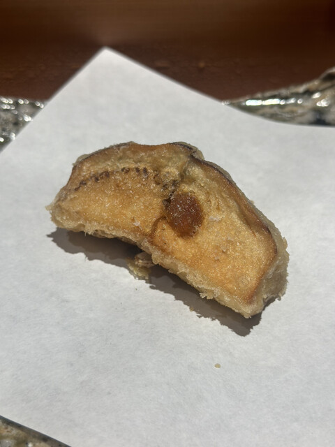 つぶ貝の天ぷら!?なんて食べたことないけど、つぶ貝の天ぷらってこんなに美味しいんやwってかんじです!串にささってて、プリプリで、味つけされていて、めっちゃ美味しい!これ、ヤミツキなります。