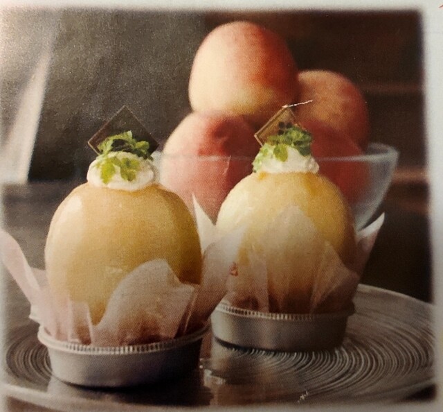 桃をまるっと使った贅沢ケーキ。甘熟の桃の中から溢れてくるカスタードクリーム◎