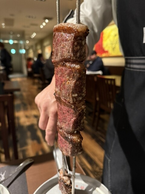 サラダを終え、テーブルのコインを赤→緑にすると、いよいよシュラスコが始まる。