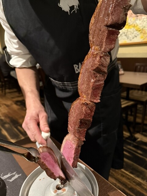 焼き立ての肉を携えたスタッフが次々とテーブルを回り、目の前で好きな量を切り分けてくれる。