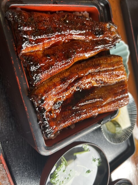 鰻丼、鰻重(ご飯と鰻が別)、直重(鰻がご飯の上にある、いわゆる鰻重)があり、それぞれ並と上がある。直重だけ特上がある。上の写真は上の直重 これはモルヒネ級(個人の感想ですw)