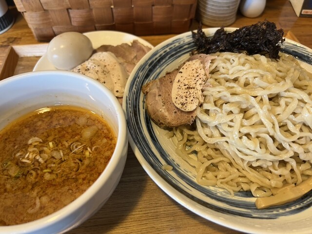 「豚出汁と背脂のつけそば」1000円 大盛り(+150円)にして、煮卵(150円)とチャーシュー(300円)追加。