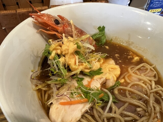 う…うまい。そして合う!思わず笑ってしまう。エビの旨み、ムール貝の旨みが前面に立つ。今までなかったのが不思議なくらい。強いて言えば北海道の一幻が近いか。でもこれは完璧にブイヤベース。ラーメンの方なんか見向きもしなさそうにブイヤベース。でも気がついたらラーメンと肩組んでる。煮干し鰹節が入っているというけど、ちょっと気が付かなかった。これが隠し味というものか。二つを結びつける仕事をしてるのだと思うが…