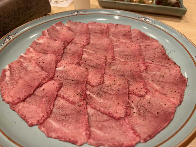 今回は6人で来店。『たん平コース』(15000円)をお願いしました。勉強も目一杯して疲れたところで生ビールで乾杯。『あーりがとぅございまーす』店長声デカ過ぎ笑。最初に出てきたのはセンマイ刺し。生臭さなし。ゴマタレをつけていただきます。食感は最初、見た目よりボソボソして乾いた感じですが、噛んでいると変わって来てシャキシャキして『いい感じ』になります。これはレベル高いね、ってみんなの感覚が伝わってきます。最初の皿からクオリティが高くテンションあがります。『あーりがとぅございまーす』いつ叫ぶか読めない笑。