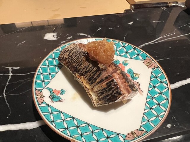 サンマ。これほどあからさまに炙ったお鮨はあったろうか。美味しーいサンマの塩焼きを、だけどしっかりお鮨に結びつけて。何個でも食べられる。